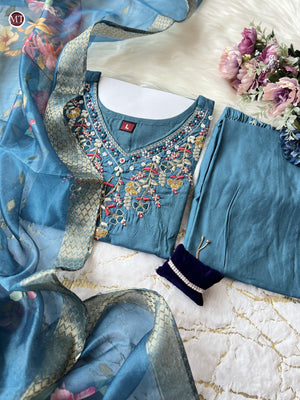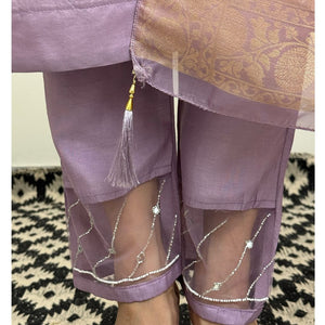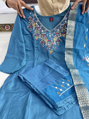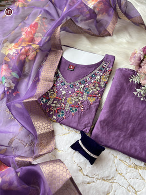 step into the world style subtle glamour with our new PRIMIUM CHANDERI SILK Kurta pent Duppata set , the Kurta has beautiful HAND WORK |
