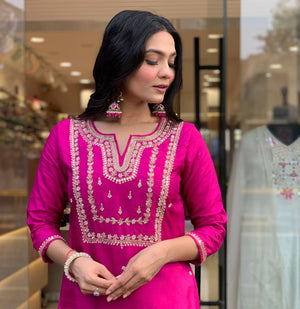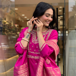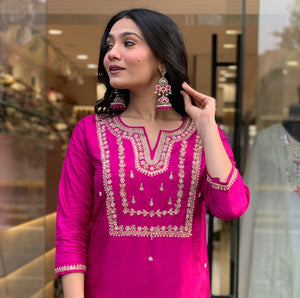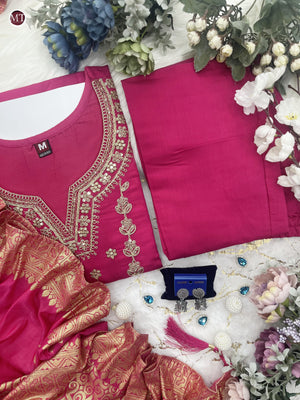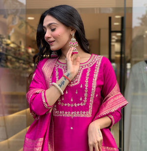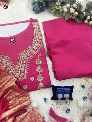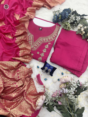 Featuring beautiful Heavy Suit Set which is beautifully decorated with intricate embroidery Work, Zari weaving . It is paired with matching pants and Jequard Dupatta |