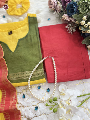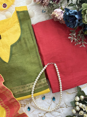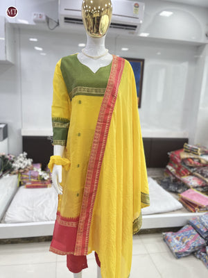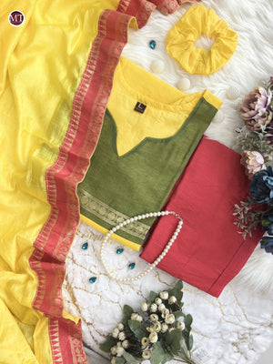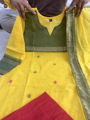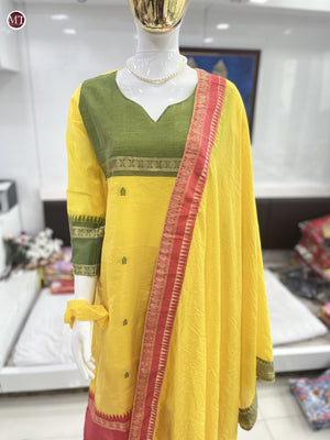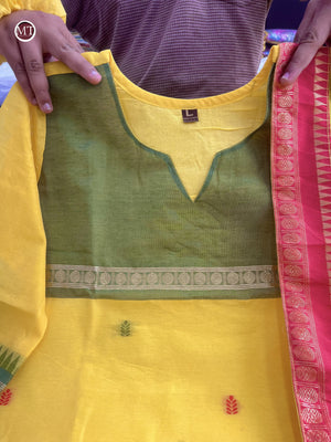 Featuring Beautiful Suit Sets in pure KANCHI COTTON Top pent with duppta with jcard wiving, it is beautifully decorated with south cutural desgins prints and hand zari wiving It is paired with matching pants and pure wiving zari jacard dupatta. A must've for your upcoming gatherings. |