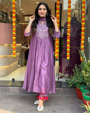 Original Mirror HandWork On Neck Introducing our stunning Kurti Pant Dupatta Set, featuring an elegant Alia cut kurti with real mirror work on the yoke for a touch of sparkle. Designed with pleats flowing from the neck, this kurti comes in a graceful flair for added movement. Available in vibrant color options of purple and lemon green, this set is perfect for festive and special occasions, combining traditional charm with contemporary styl. |