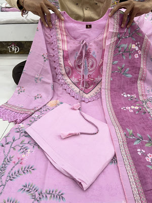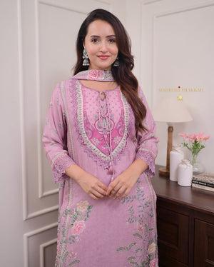 Featuring Lilac Muslin Pakistani Suit which is beautifully decorated with digital prints and hand embroidery. It is absolutely perfect for your upcoming occasions, it is very easy breezy and comfortable.