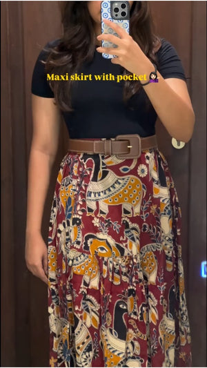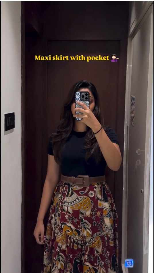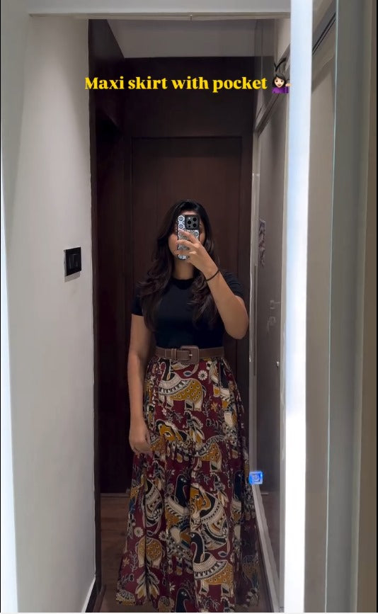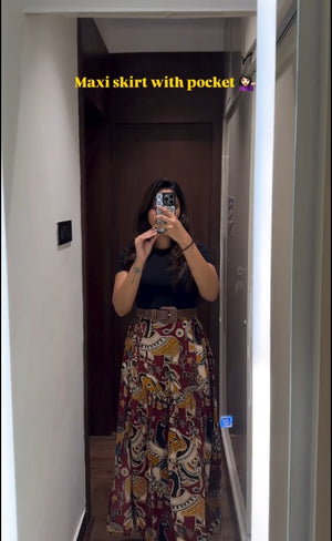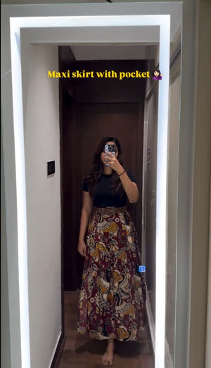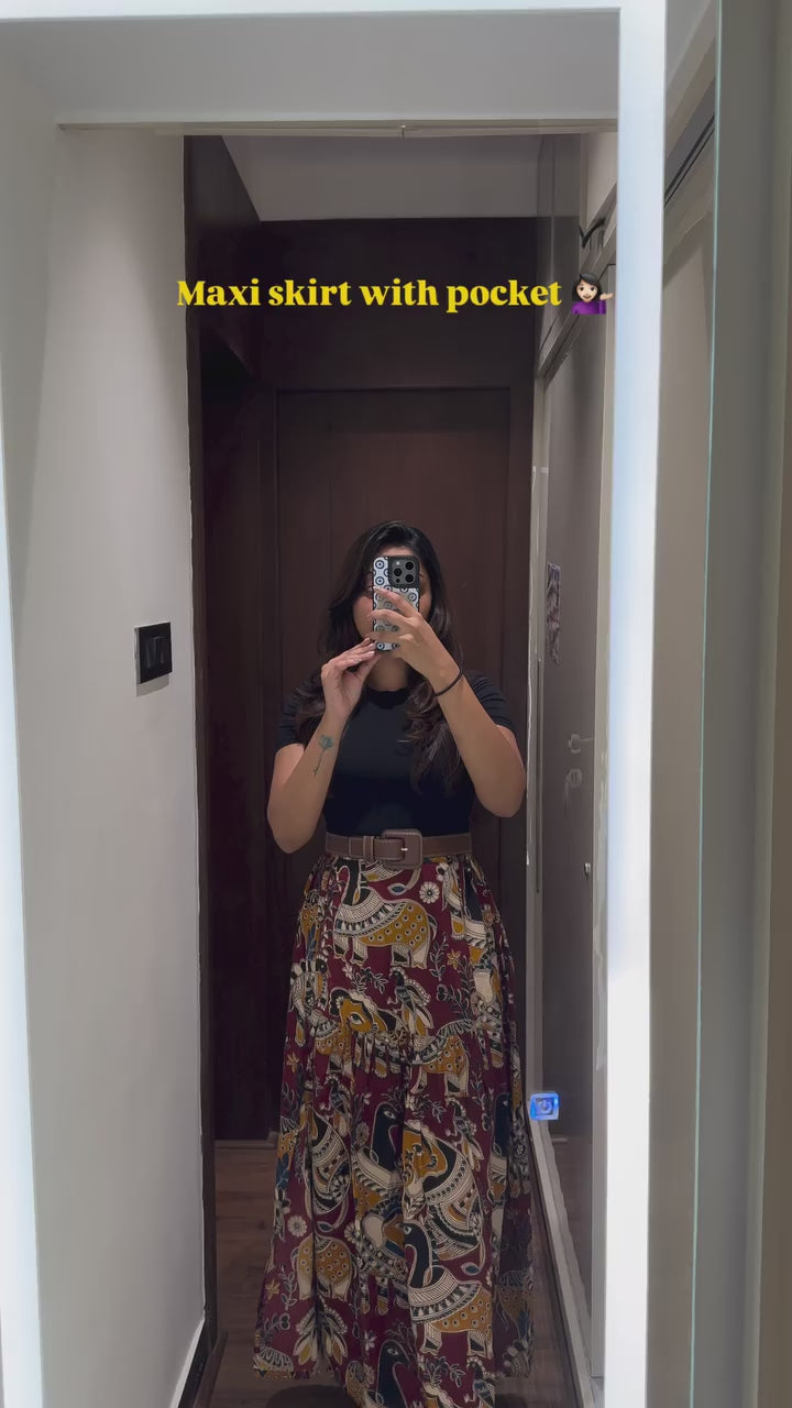 Wearing this beautiful printed maxi skirt — comfy, stylish, and yes… it has pockets! Perfect for everyday wear or casual outings. 💕✨