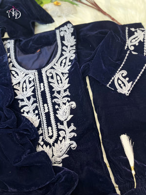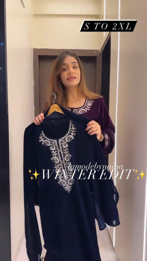 Presenting VELVET SUIT SET WITH FINE EMBROIDERY ON THE NECK COMING ALONG WITH STRAIGHT VELVET KURTA PANTS DUPPTA
